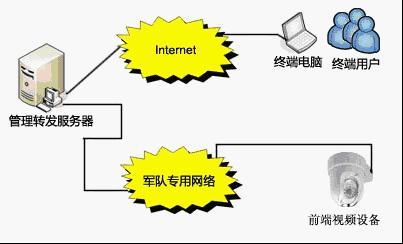 管理轉(zhuǎn)發(fā)服務(wù)器接收到數(shù)字信號后,可以直接將數(shù)據(jù)轉(zhuǎn)發(fā)到internet網(wǎng)絡(luò)中,監(jiān)控終端通過internet就可以訪問到軍隊監(jiān)控系統(tǒng)中的實時視頻。如下圖所示: