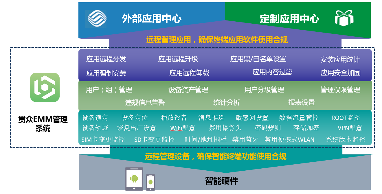 為解決解決黨政軍放寬智能手機使用后面臨的設備安全、鏈路安全、數據泄露、可信接入、惡意軟件、上網管控等問題,中國移動推出了貫眾EMM智能終端安全一站式方案,有效管理移動終端設備,保障移動設備上數據的安全。