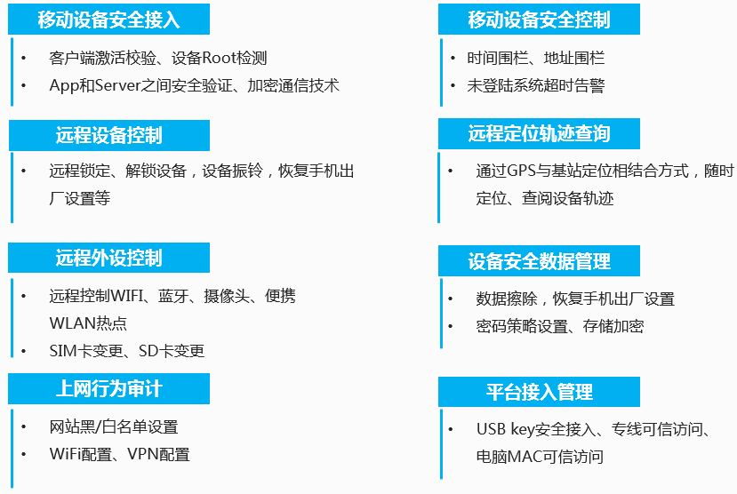 1、針對黨政軍客戶需求定制的手機安全管理信息化服務平臺,對設備管控、違規處理,涉密追蹤等信息安全處理更有保障;
