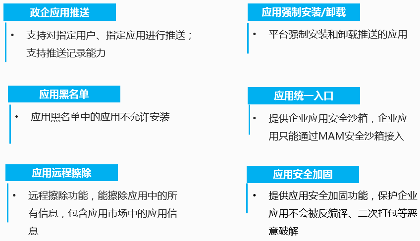 管理員可以通過定制應用商店進行應用分發,保證設備工作區只能安裝經過管理審核后應用,通過管理平臺能夠推送應用到用戶設備,保障客戶對設備應用的管控和應用數據的安全。
