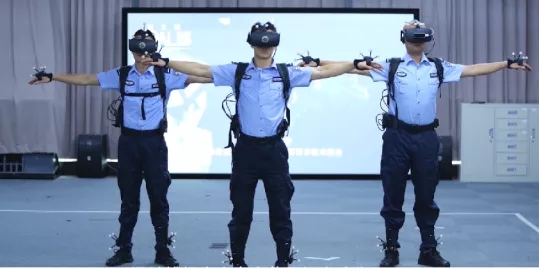 警員可在空間動捕范圍內佩戴相應裝備,通過頭載顯示可沉浸于某想定場景。每名警員均以第一視角處于需要執行任務的位置,警員相互間可通過語音或手勢系統對過往虛擬人員進行盤查、核錄,場景中加入AI行人和可疑人員。警員需針對某些特征對于可疑人員的動作、形態等進行分析,并進行重點盤查。AI可設置發生多種突發情況,警員需通過多人間的相互配合將日常學習的技戰術方法融入到訓練中。如發生可疑人物反擊、逃跑等動作,需及時進行現場布控,疏散群眾、引導群眾有效撤離防止踩踏事故,如遇大規模事件,可通過語音的方式請求指揮中心增派人員進行支持,場外預備警員可隨時進入虛擬場景進行協同配合,并及時處置可疑人員。