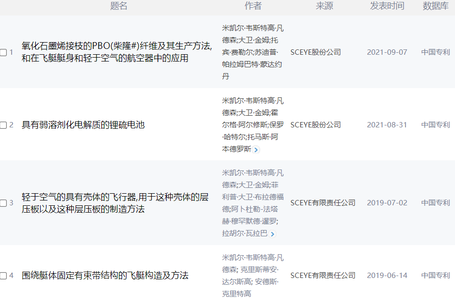 sceye公司的HAPS平流層飛艇采用了大量先進(jìn)技術(shù),并在國(guó)際上、甚至在中囯專利局都申請(qǐng)了諸多專利,其中主要是在平流層飛艇的囊體材料、儲(chǔ)能電池和總體結(jié)構(gòu)設(shè)計(jì)等方面。