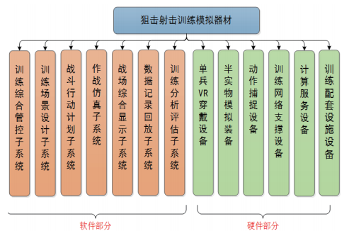狙擊射擊訓(xùn)練模擬器材用于開展狙擊小組典型作戰(zhàn)行動(dòng)的“人在回路”訓(xùn)練模擬,為狙擊手的培養(yǎng)和培養(yǎng)成果評(píng)估提供技術(shù)支撐環(huán)境,并為后續(xù)狙擊手培養(yǎng)方案的改進(jìn)優(yōu)化和適應(yīng)新的培養(yǎng)目標(biāo)提供科學(xué)依據(jù)。系統(tǒng)包括軟件部分和硬件部分,軟件系統(tǒng)由訓(xùn)練綜合管控子系統(tǒng)、訓(xùn)練場景設(shè)計(jì)子系統(tǒng)、戰(zhàn)斗行動(dòng)計(jì)劃子系統(tǒng)、作戰(zhàn)仿真子系統(tǒng)、戰(zhàn)場綜合顯示子系統(tǒng)、數(shù)據(jù)記錄回放子系統(tǒng)和訓(xùn)練分析評(píng)估子系統(tǒng)組成,硬件系統(tǒng)由單兵VR穿戴設(shè)備、半實(shí)物模擬裝備、動(dòng)作捕捉設(shè)備、訓(xùn)練網(wǎng)絡(luò)支撐設(shè)備、計(jì)算服務(wù)設(shè)備、儲(chǔ)運(yùn)一體化器材和訓(xùn)練配套設(shè)施設(shè)備組成,如下圖所示。