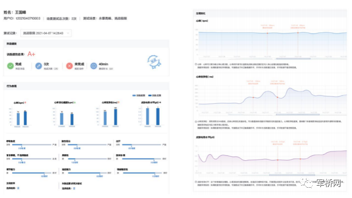 基于多種生理數據的特征提取、機器學習模型、模式識別算法,并結合訓練任務績效以及心理基線數據進行綜合訓練心理效能評估與分析,生成針對不同訓練內容的個體訓練評估報告。