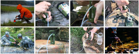 使用方式:將進水軟管放入需要凈化的水源中,抽壓手柄即可。