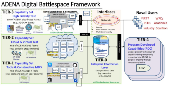 數字孿生戰場是對真實戰場中各個物理要素和物理系統的數字化、虛擬化和智能化,其核心是對真實作戰環境的逼真模擬。國外正在逐步開展數字孿生戰場的建設與應用。2022年2月至3月,美國海軍進行了“海軍聚合優勢數字生態系統(ADENA)”項目的首次演示實驗。ADENA也被稱為“沙盒”,這是一個虛擬數字孿生戰場,用于技術研究、任務規劃和實驗訓練,支持多領域、多任務和多用例應用。用戶只需要一個共享門戶來發現所需的工具、模型、數據和其他資源,并且可以使用數字工具進行按需構建和云部署。它支持用戶創建個性化的數字孿生戰場實例,開展各種作戰和技術問題研究。支持插入新設備進行一系列系統的測試和評估。