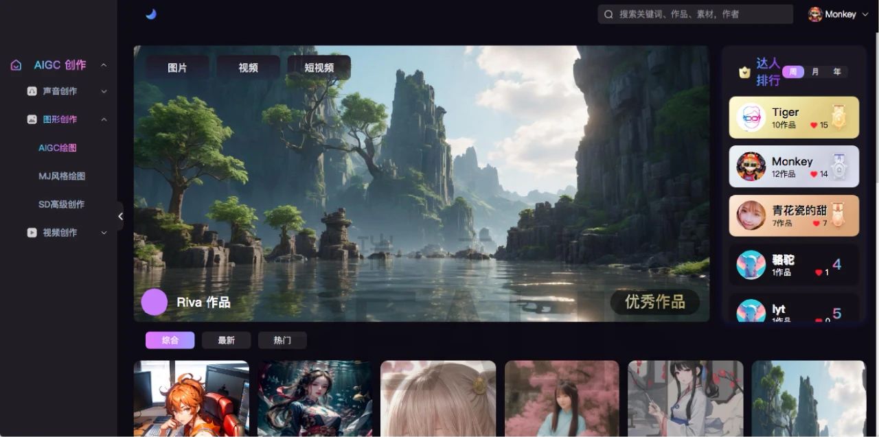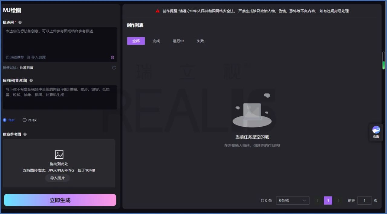 支持AI繪圖一鍵生成功能,覆蓋MJ與SD等多種風格,用戶僅需輸入簡單描述或上傳圖片,即可迅速獲得定制化的圖像,無論是卡通、寫實還是抽象風格,皆能輕松駕馭。此外,通過導入推薦詞資源和反向詞功能,用戶可以進一步細化生成內容,滿足不同場景的需求。圖片尺寸的自由設定、快速與慢速生成模式的切換,以及JPG、PEG、PNG等多種格式的支持,進一步提升了生成的靈活性與便捷性。在音頻領域,基于文本風格與情境,平臺能自動生成高質量對話配音及背景音樂/歌曲,為作品注入靈魂。