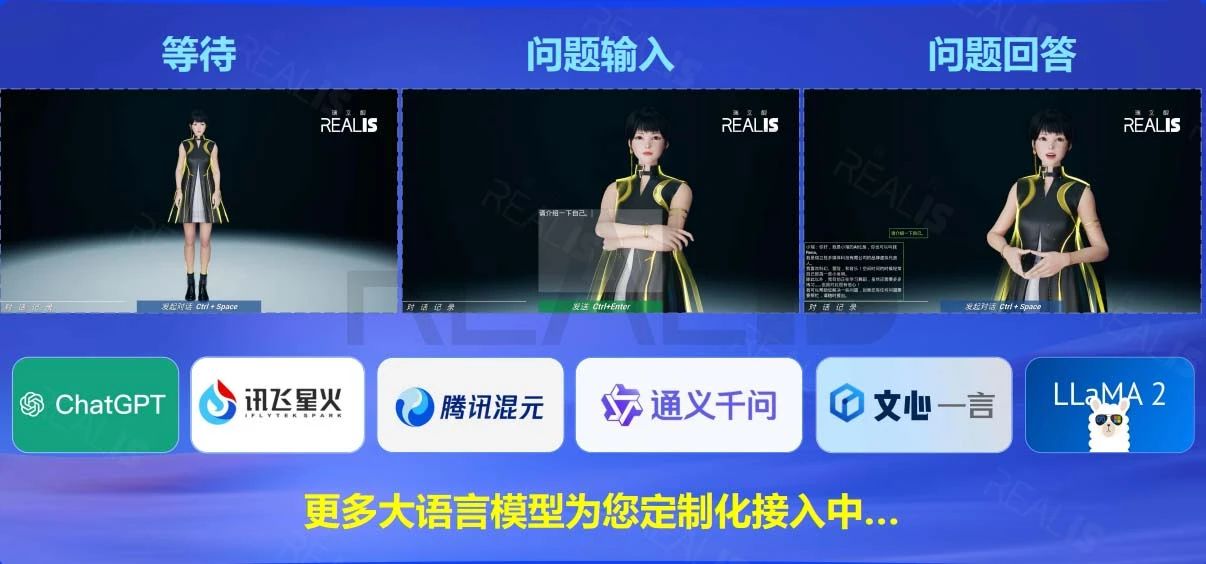 支持接入市面上主流的大語言模型,如ChatGPT、訊飛星火等,同時提供定制化接入服務,結合知識圖譜技術,使數字人能夠深入理解用戶對話內容,識別情感與意圖,模擬人類真實語言習慣,實現更貼近自然的交流。通過機器學習,數字人的語言能力能夠自我提升,自動迭代優化,滿足多樣化場景下的定制需求。