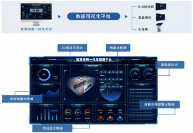 數據可視化平臺可將智慧檔案室內的各類數據實時顯示,化繁為簡,賦能檔案室設備管理自動管理,檔案管理高效化。將傳統枯燥的檔案數據變為直觀清晰的大數據進行展示,對海量數據進行實時、全程、全面的檢測。并且DID拼接屏(液晶電視、引導屏)可上墻展示,檔案室效果盡顯美觀、大氣。