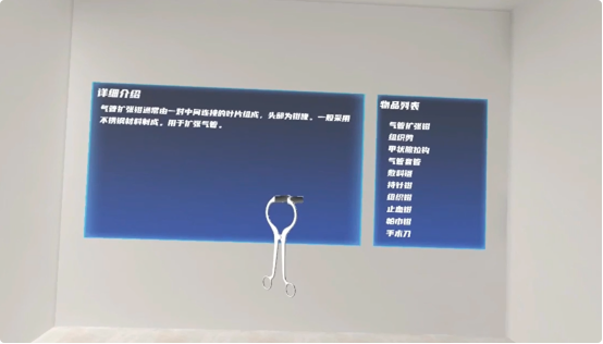 工具認(rèn)知模塊:包含手術(shù)中常用的各種工具,如氣管套管、手術(shù)刀、組織鉗、持針鉗、止血鉗、氣管擴(kuò)張鉗、帕巾鉗、組織剪、甲狀腺組織拉鉤、敷料鑷等。醫(yī)生通過虛擬交互操作模擬使用每個(gè)工具,系統(tǒng)提供詳細(xì)介紹和高亮顯示,增強(qiáng)對(duì)工具的實(shí)際認(rèn)知和操作技能。