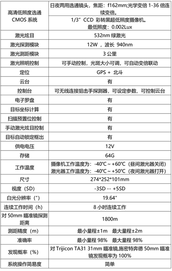 10、具備偵測反狙擊手功能:利用紅外探測激光照射瞄準鏡鏡片,接收反射回來的信息,經攝像機處理到并發出報警,有效地發現定位狙擊手。