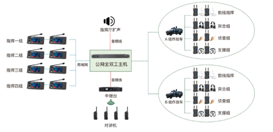 軍警人員在處理突發事件時,情況緊急需要隊員全神貫注地投入,且手拿防暴盾牌與武器的隊員雙手被占用,無法同時兼顧傳統對講機通話。無線全雙工通話系統允許多人同時講話最大限度地避免占線問題,亦可免按鍵無需操作實時通話,解放雙手自由交流。且指揮中心可按照警種軍種或團隊協同的方式,將所有人員分成不同的組別,可選擇其中一組、多組或全員進行實時雙向通話和指揮調度。